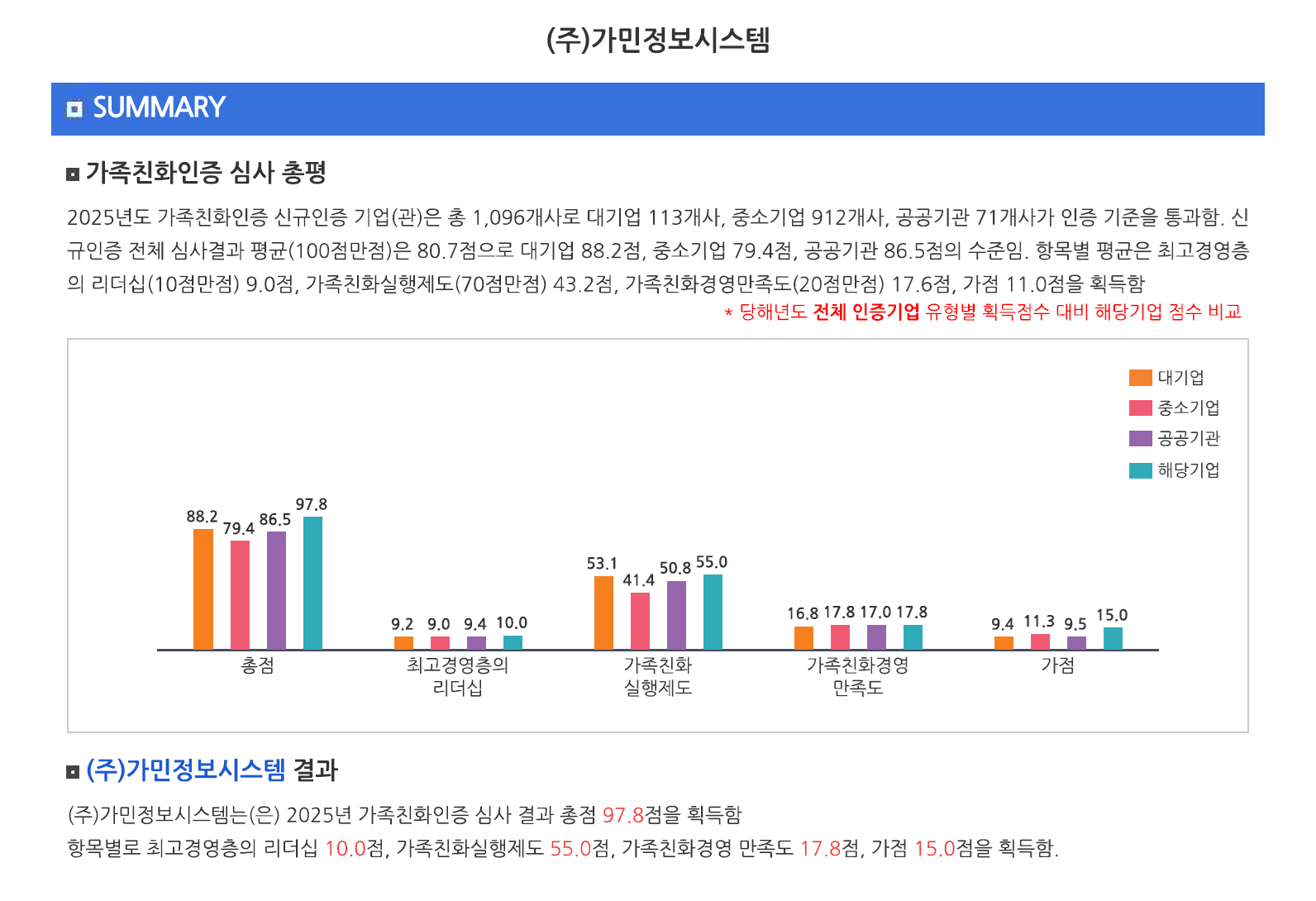 (주)가민정보시스템이 12월 1일자로 성평등가족부가 주관하는 ‘가족친화인증’을 신규 획득하며, 일과 생활의 균형을 실천하는 가족친화기업으로 선정되었습니다.