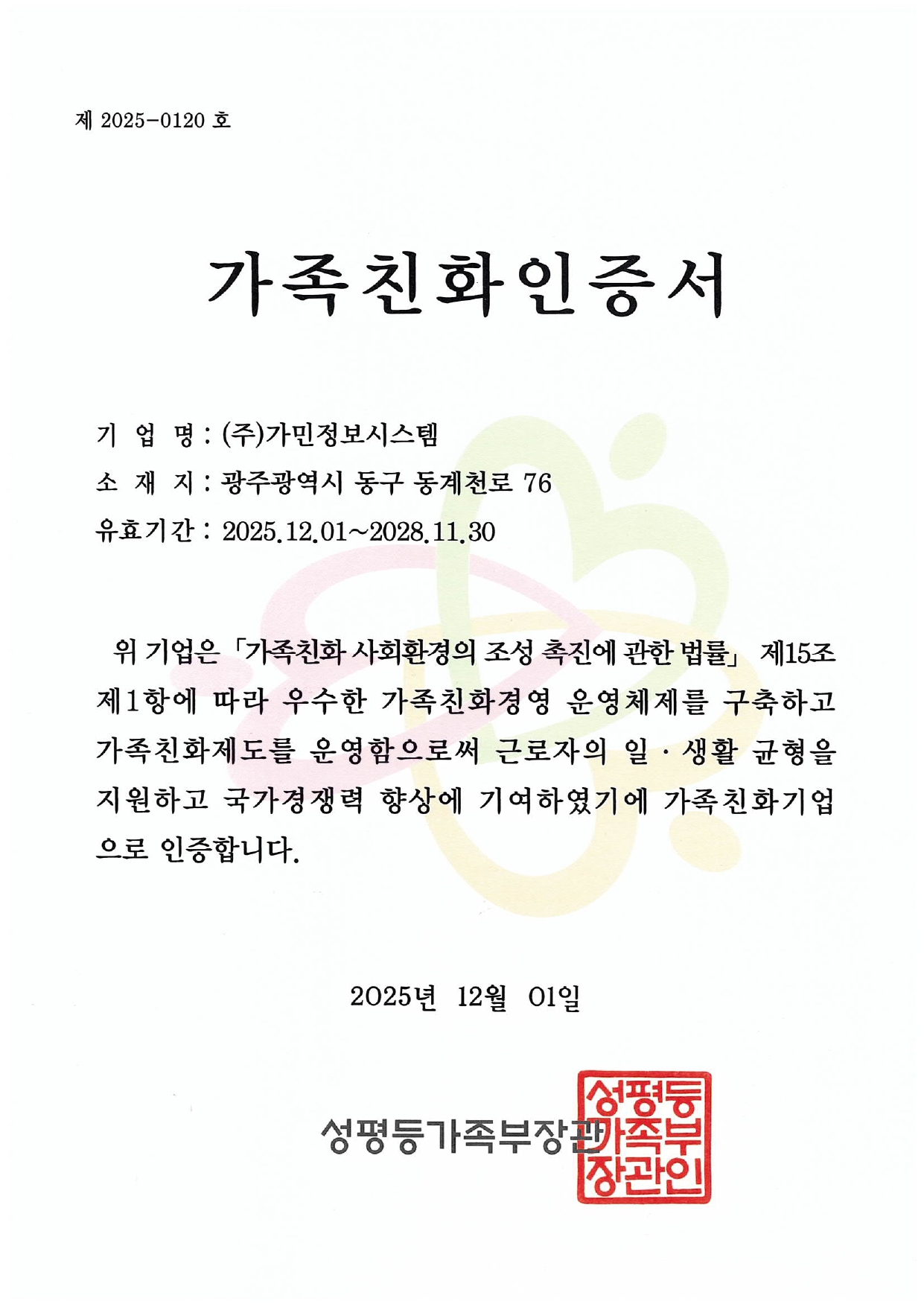 (주)가민정보시스템이 12월 1일자로 성평등가족부가 주관하는 ‘가족친화인증’을 신규 획득하며, 일과 생활의 균형을 실천하는 가족친화기업으로 선정되었습니다.